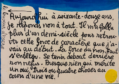 L’œuvre picturale de Dany Laferrière s’inscrit naturellement dans la lignée de ces écrivains-peintres-dessinateurs. On peut ainsi se souvenir des paysages à l'encre de Victor Hugo, des lignes fluides de Jean Cocteau, ou des collages de Jacques Prévert. Cette touche de surréalisme m'a d'ailleurs rappelé que nous attendons avec impatience la rétrospective Leonora Carrington au Musée du Luxembourg ce printemps !